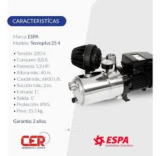 La bomba ESPA Tecnoplus 25-4 está diseñada para proporcionar presión constante y eficiencia energética en instalaciones domésticas y comerciales. Gracias a su tecnología de velocidad variable, adapta automáticamente la potencia del motor a la demanda de agua, evitando fluctuaciones de presión y reduciendo el consumo eléctrico.