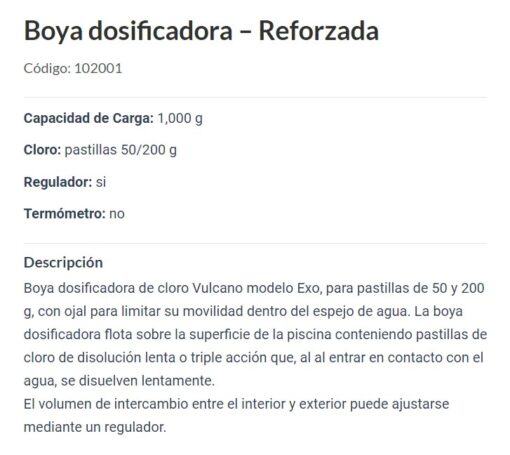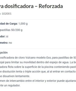 La característica más importante de esta boya VULCANO es su mecanismo de regulación. Mediante una rejilla o apertura ajustable en la base, el usuario puede controlar la cantidad de pastillas de cloro que están en contacto con el agua y, por lo tanto, la velocidad a la que se disuelve el químico. Esto permite un ajuste fino de la desinfección según el tamaño de la piscina, la temperatura y el uso. Fabricada con plástico ABS resistente y a prueba de productos químicos, la boya garantiza una larga vida útil a la intemperie. Es la inversión clave que garantiza una desinfección continua, segura y eficiente de su piscina.
